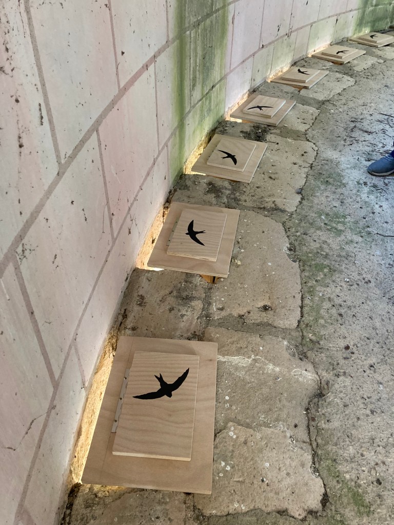 John Touchet, un grand passionné de martinets qui connaît bien le château, a été le coordinateur de ce projet. La plupart des nichoirs ont été fabriqués sur mesure pour ce site inhabituel par Michel Halin, avec un profil de martinets ajouté sur chacun par Isabelle Halin.